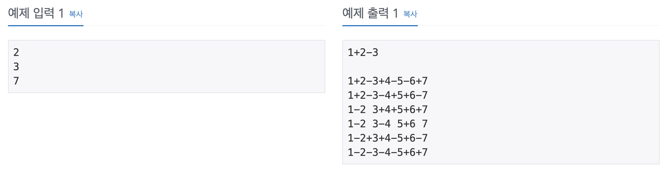 1부터 N까지의 수를 오름차순으로 쓴 수열 1 2 3 ... N을 생각하자. 그리고 '+'나 '-', 또는 ' '(공백)을 숫자 사이에 삽입하자(+는 더하기, -는 빼기, 공백은 숫자를 이어 붙이는 것을 뜻한다). 이렇게 만든 수식의 값을 계산하고 그 결과가 0이 될 수 있는지를 살피자. N이 주어졌을 때 수식의 결과가 0이 되는 모든 수식을 찾는 프로그램을 작성하라. 입력첫 번째 줄에 테스트 케이스의 개수가 주어진다(<10). 각 테스트 케이스엔 자연수 N이 주어진다(3 <= N <= 9). 출력각 테스트 케이스에 대해 ASCII 순서에 따라 결과가 0이 되는 모든 수식을 출력한다. 각 테스트 케이스의 결과는 한 줄을 띄워 구분한다. ![]() |