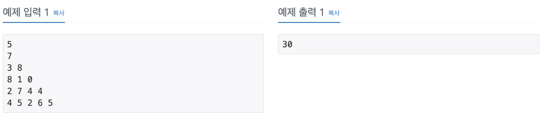 ![]() 위 그림은 크기가 5인 정수 삼각형의 한 모습이다. 맨 위층 7부터 시작해서 아래에 있는 수 중 하나를 선택하여 아래층으로 내려올 때, 이제까지 선택된 수의 합이 최대가 되는 경로를 구하는 프로그램을 작성하라. 아래층에 있는 수는 현재 층에서 선택된 수의 대각선 왼쪽 또는 대각선 오른쪽에 있는 것 중에서만 선택할 수 있다. 삼각형의 크기는 1 이상 500 이하이다. 삼각형을 이루고 있는 각 수는 모두 정수이며, 범위는 0 이상 9999 이하이다. 입력첫째 줄에 삼각형의 크기 n(1 ≤ n ≤ 500)이 주어지고, 둘째 줄부터 n+1번째 줄까지 정수 삼각형이 주어진다. 출력첫째 줄에 합이 최대가 되는 경로에 있는 수의 합을 출력한다. ![]() |