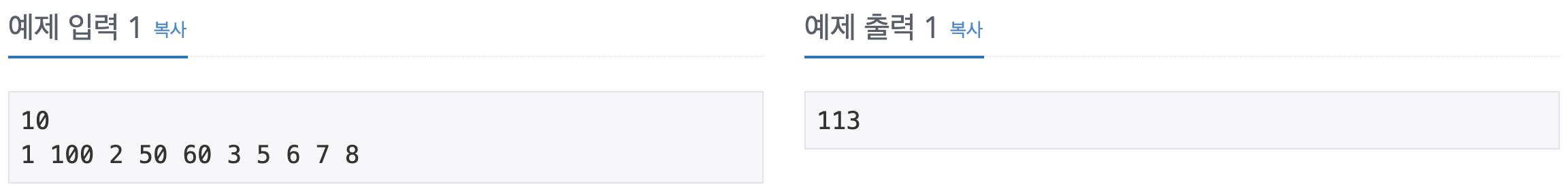수열 A가 주어졌을 때, 그 수열의 증가 부분 수열 중에서 합이 가장 큰 것을 구하는 프로그램을 작성하시오. 예를 들어, 수열 A = {1, 100, 2, 50, 60, 3, 5, 6, 7, 8} 인 경우에 합이 가장 큰 증가 부분 수열은 A = {1, 100, 2, 50, 60, 3, 5, 6, 7, 8} 이고, 합은 113이다. 입력첫째 줄에 수열 A의 크기 N (1 ≤ N ≤ 1,000)이 주어진다. 둘째 줄에는 수열 A를 이루고 있는 Ai가 주어진다. (1 ≤ Ai ≤ 1,000) 출력첫째 줄에 수열 A의 합이 가장 큰 증가 부분 수열의 합을 출력한다. ![]() |