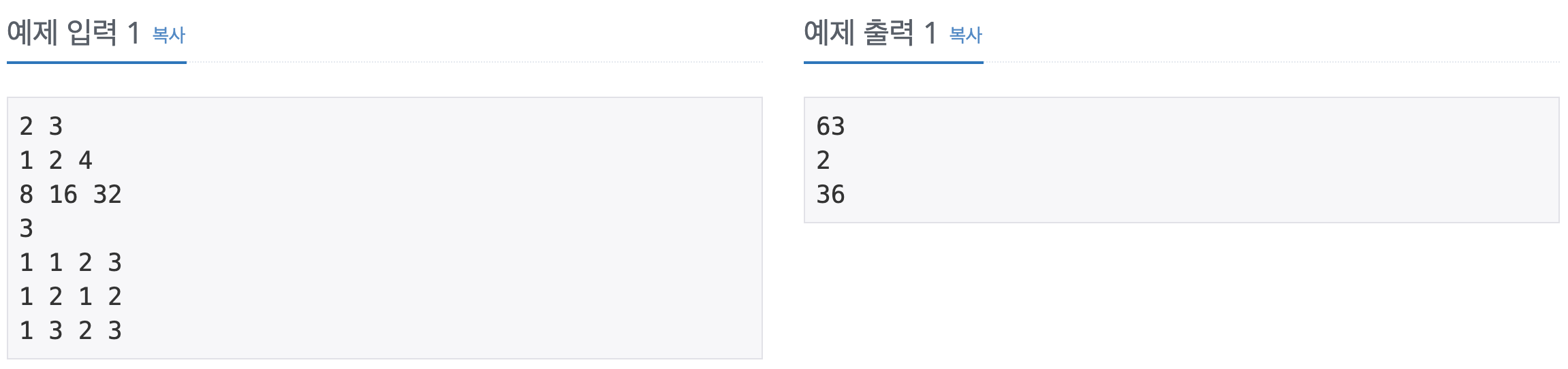 2차원 배열이 주어졌을 때 (i, j) 위치부터 (x, y) 위치까지에 저장되어 있는 수들의 합을 구하는 프로그램을 작성하시오. 배열의 (i, j) 위치는 i행 j열을 나타낸다. 입력첫째 줄에 배열의 크기 N, M(1 ≤ N, M ≤ 300)이 주어진다. 다음 N개의 줄에는 M개의 정수로 배열이 주어진다. 배열에 포함되어 있는 수는 절댓값이 10,000보다 작거나 같은 정수이다. 그 다음 줄에는 합을 구할 부분의 개수 K(1 ≤ K ≤ 10,000)가 주어진다. 다음 K개의 줄에는 네 개의 정수로 i, j, x, y가 주어진다(i ≤ x, j ≤ y). 출력K개의 줄에 순서대로 배열의 합을 출력한다. 배열의 합은 231-1보다 작거나 같다. ![]() |