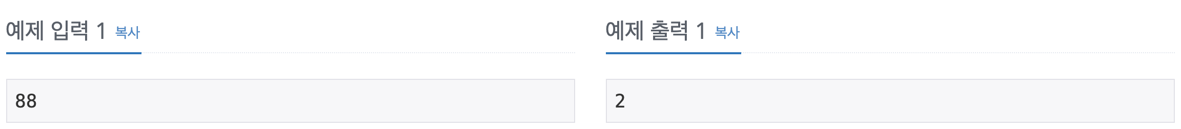 필요한 스티커를 사러 고려대 하나스퀘어 유니스토어에 도착한 근우는 고민이 생겼다. 스티커 팩에는 [0]부터 [9]까지 스티커가 한 장씩 밖에 없으면서 생각보다 너무 비싼 것이다! 그렇기에 근우는 0부터 N까지 모든 수를 하나씩 표현할 수 있게 최소한의 스티커 팩만 사려고 한다. 근우는 매우 똑똑하지만, 스티커 팩 가격에 충격을 받아 계산할 수 없는 상태가 돼버렸다. 여러분이 근우의 최대 목표액 N이 주어졌을 때, 근우가 필요한 최소 스티커 팩의 개수를 구해주자. 입력첫 번째 줄에 근우의 연봉 최댓값을 의미하는 정수 N이 주어진다. (0 ≤ N ≤ 1,000,000,000) 출력첫 번째 줄에 근우가 0부터 N까지 스티커로 표현하기 위해 구매해야 하는 스티커 팩의 최소 개수를 출력한다. ![]() |