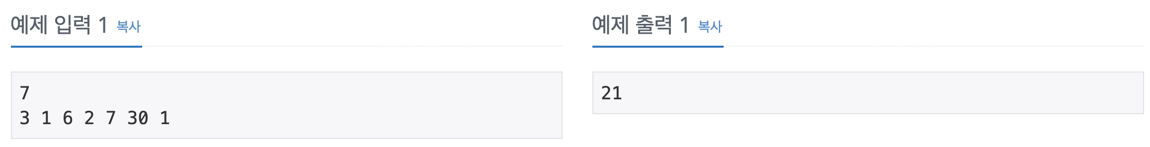 | 하나의 양팔 저울을 이용하여 물건의 무게를 측정하려고 한다. 이 저울의 양 팔의 끝에는 물건이나 추를 올려놓는 접시가 달려 있고, 양팔의 길이는 같다. 또한, 저울의 한쪽에는 저울추들만 놓을 수 있고, 다른 쪽에는 무게를 측정하려는 물건만 올려놓을 수 있다. 무게가 양의 정수인 N개의 저울추가 주어질 때, 이 추들을 사용하여 측정할 수 없는 양의 정수 무게 중 최솟값을 구하는 프로그램을 작성하시오. 예를 들어, 무게가 각각 3, 1, 6, 2, 7, 30, 1인 7개의 저울추가 주어졌을 때, 이 추들로 측정할 수 없는 양의 정수 무게 중 최솟값은 21이다. 입력첫 째 줄에는 저울추의 개수를 나타내는 양의 정수 N이 주어진다. N은 1 이상 1,000 이하이다. 둘째 줄에는 저울추의 무게를 나타내는 N개의 양의 정수가 빈칸을 사이에 두고 주어진다. 각 추의 무게는 1이상 1,000,000 이하이다. 출력첫째 줄에 주어진 추들로 측정할 수 없는 양의 정수 무게 중 최솟값을 출력한다. ![]() |