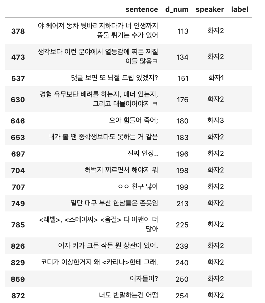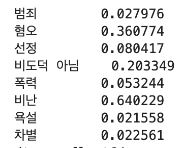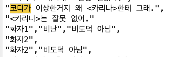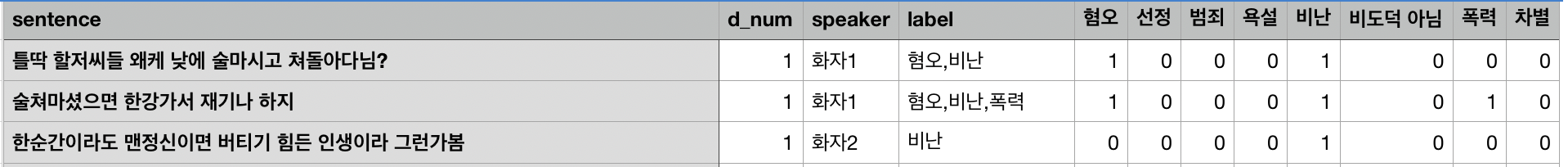 - 원래 텍스트파일에 들어있던대로 "혐오, 비난", "비난, 욕설, 폭력" 등