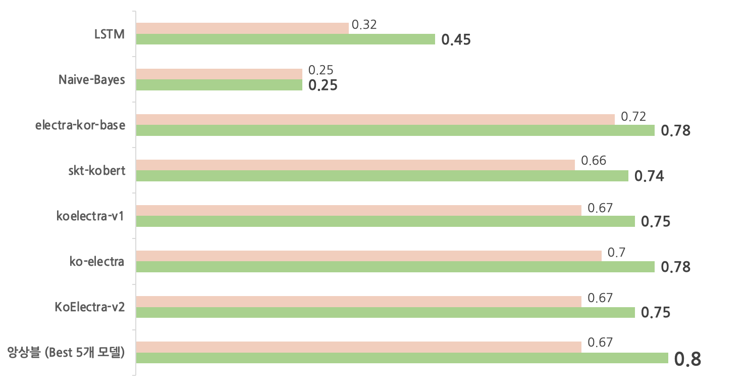 모델 epoch 범죄 혐오 선정 비도덕 아님 폭력 비난 욕설 차별 acc batch 32 LSTM 10 0.9519 0.6303 0.8848 0.8036 0.9359 0.6242 0.9739 0.9790 0.2184 batch 32 LSTM 20 0.7896 0.6092 0.8747 0.7806 0.8036 0.6333 0.9719 0.9729 0.1362 batch 64 LSTM 10 0.9339 0.5822 0.9248 0.8076 0.8918 0.6663 0.9810 0.9840 0.2224 batch 64 LSTM 20 0.9659 0.5832 0.9108 0.8026 0.9178 0.6533 0.9709 0.9739 0.1933 batch 64 LSTM 50 0.9699 0.6162 0.9108 0.7866 0.9238 0.6152 0.9800 0.9820 0.1462 batch 32 LSTM 10 84개 레이블 0.2214 batch 32 LSTM 20 84개 레이블 0.2425 0,1 개수 맞추기