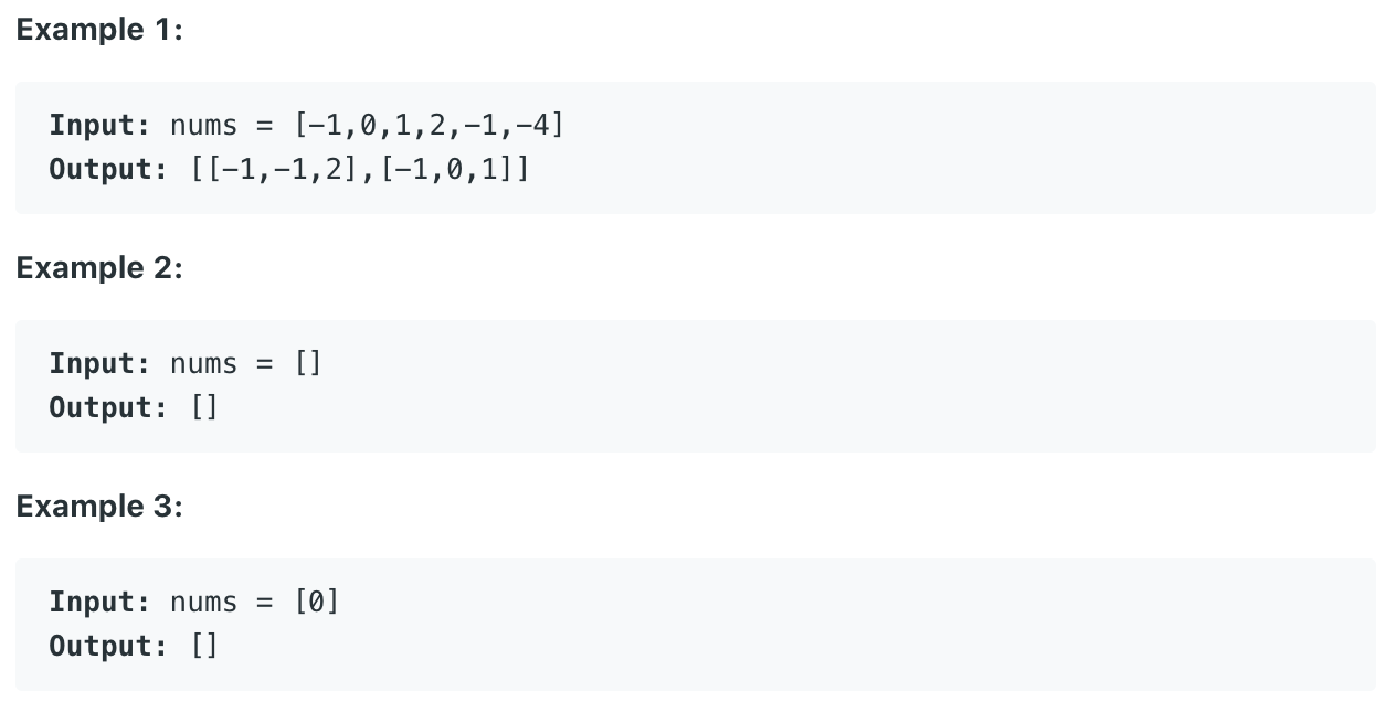 Given an array nums of n integers, are there elements a, b, c in nums such that a + b + c = 0? Find all unique triplets in the array which gives the sum of zero. Notice that the solution set must not contain duplicate triplets. ![]() Constraints: